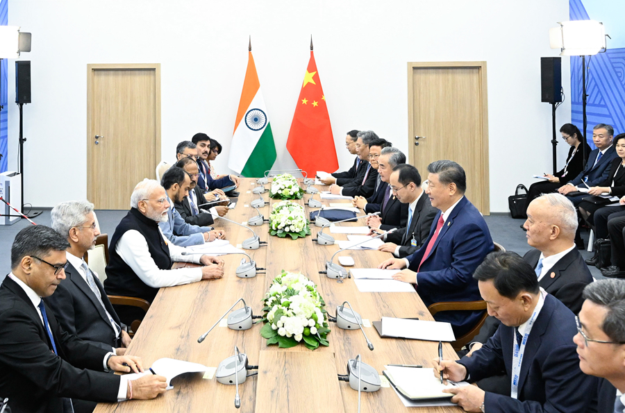 当地时间10月23日,国家主席习近平在喀山出席金砖国家领导人会晤期间会见印度总理莫迪。
