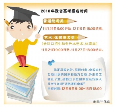 11月20日,记者从省招办获悉,我省2018年高考报名21日9:00启动,参加艺术类和体育类专业省统考的考生报名截止时间为11月27日18:00,其他考生报名截止时间为12月9日18:00。