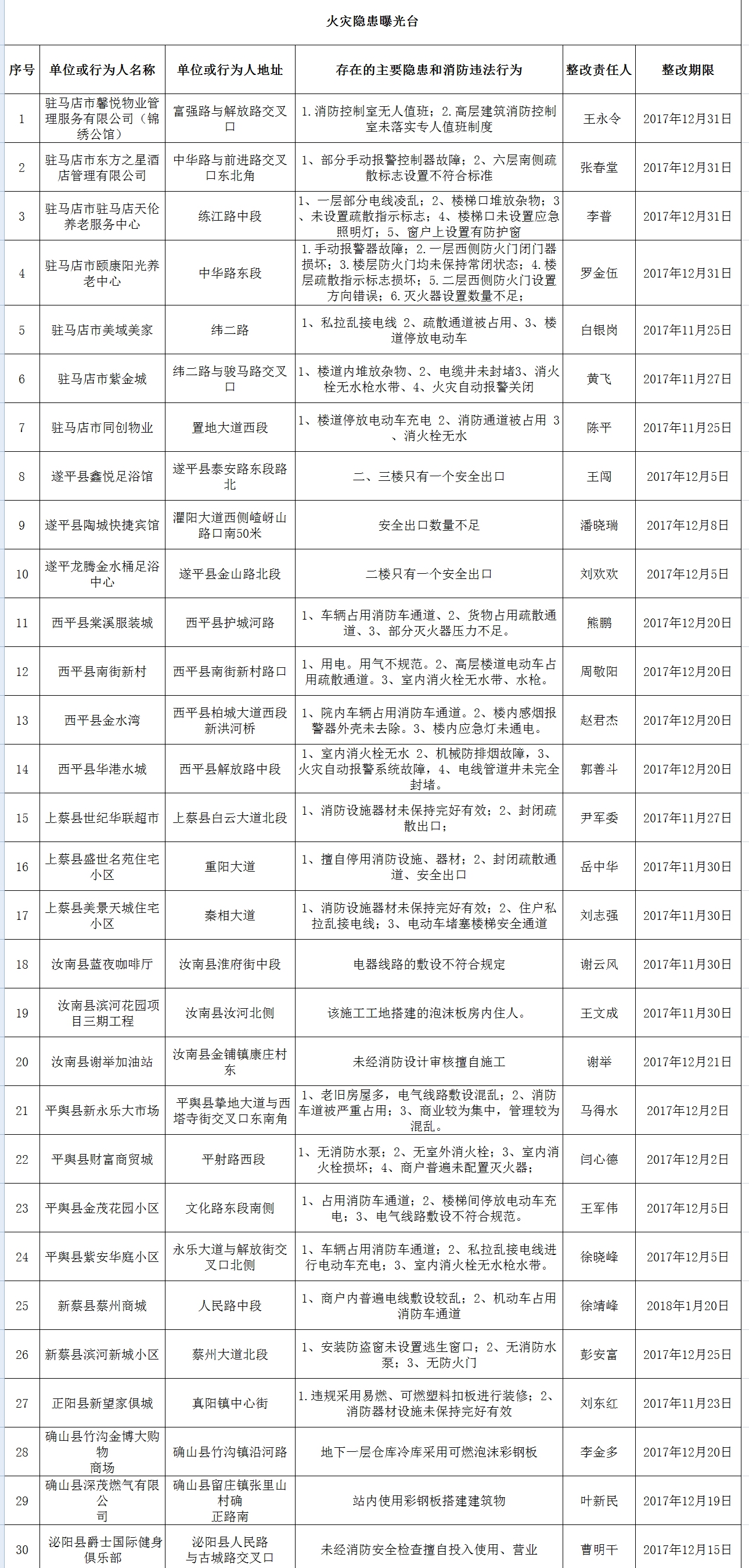 【驻马店广视融媒讯】为做好重大火灾隐患整改,驻马店市防火安全委员会对30家存在火灾隐患和消防违法行为的单位进行集中曝光,希望被曝光单位明确细化整改工作责任,认真落实隐患整改计划,确保隐患如期销案。