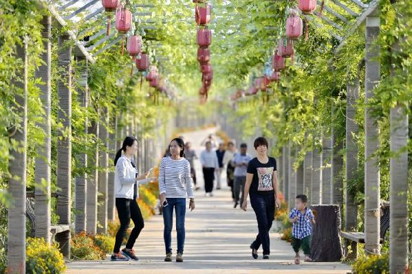 游客在河北省巨鹿县金玉庄村金银花园艺小镇内游览(10月10日摄)。近年来,河北省巨鹿县打造了金银花园艺小镇、柳洼风情小镇等一批特色小镇。新华社记者 牟宇 摄