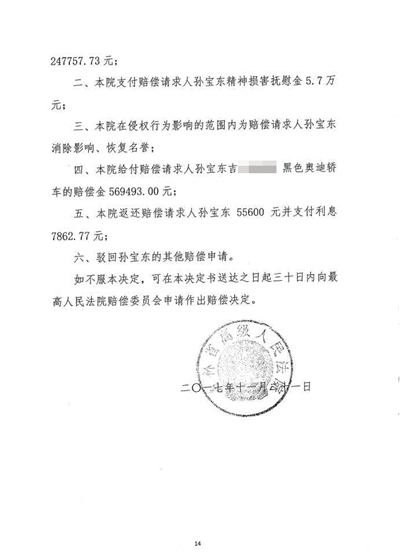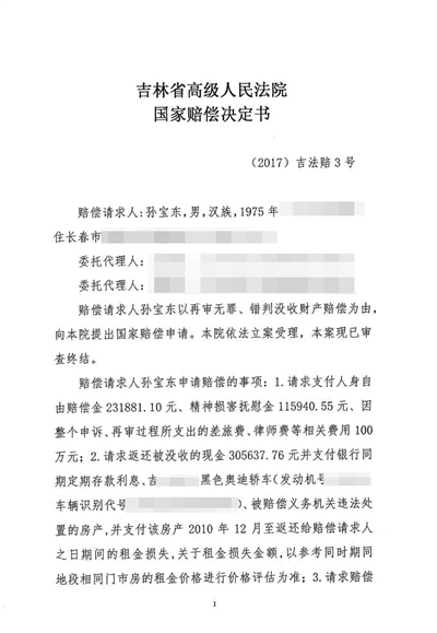11月21日,吉林省高院做出国家赔偿决定书,决定支付孙宝东人身自由赔偿金、精神损害抚慰金、返还相关财产等共计90余万元。