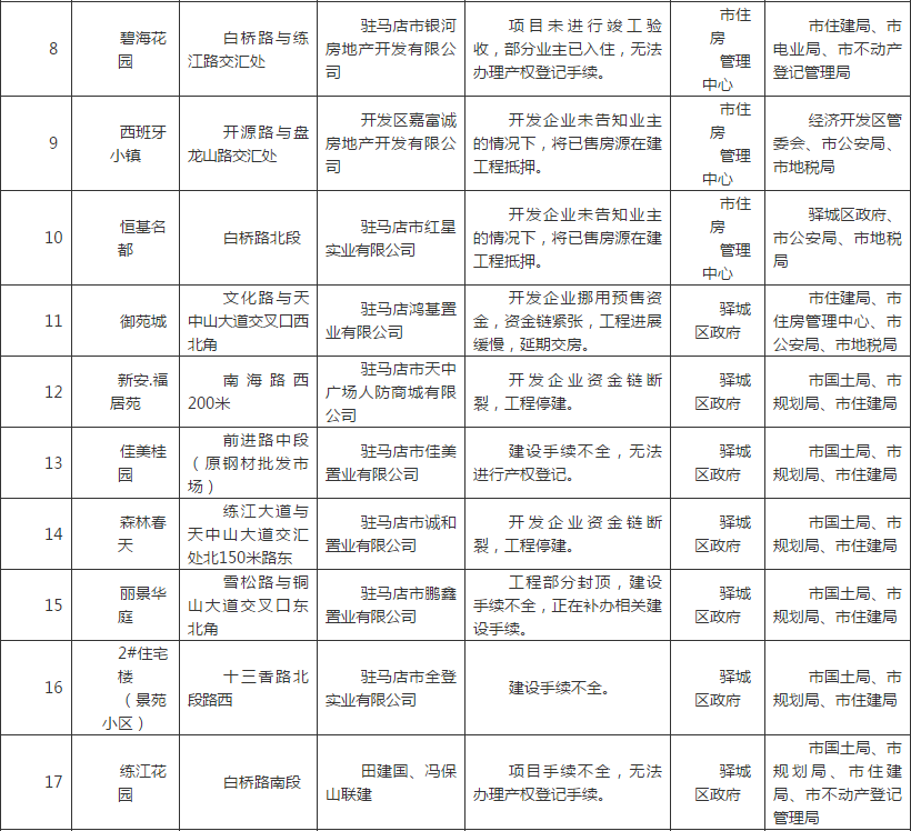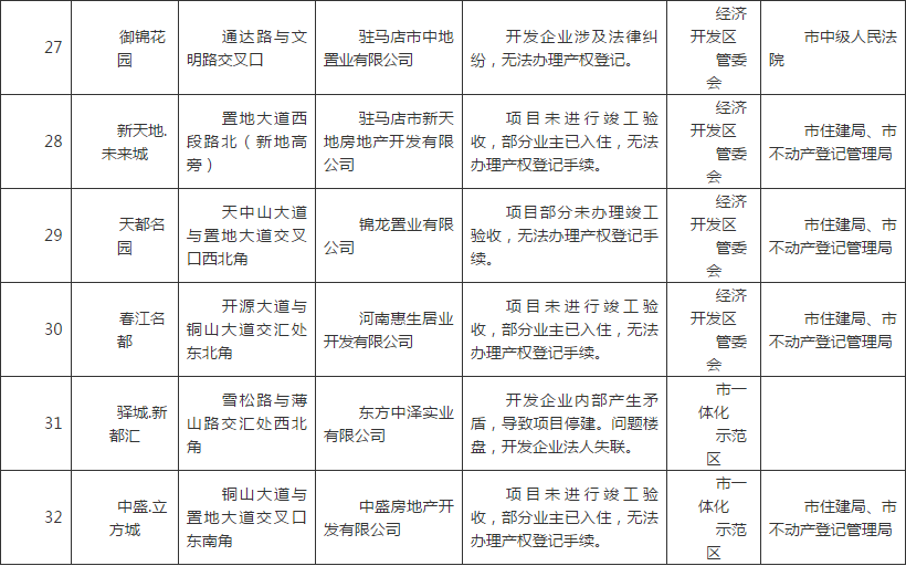 为盘活问题楼盘房地产项目,促进驻马店市房地产市场平稳健康发展,11月9日市政府召开会议,专题研究中心城区问题楼盘的解决措施,对已排查的市中心城区32个问题楼盘当前现状、存在问题进行分析研判。会议要求各辖区政府(管委会)和相关单位要按照责任分工,加强协调、密切配合,进一步核实问题楼盘有关情况,制定解决方案,努力化解问题楼盘信访问题。