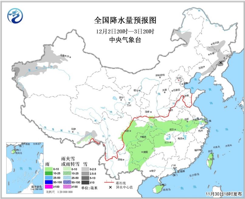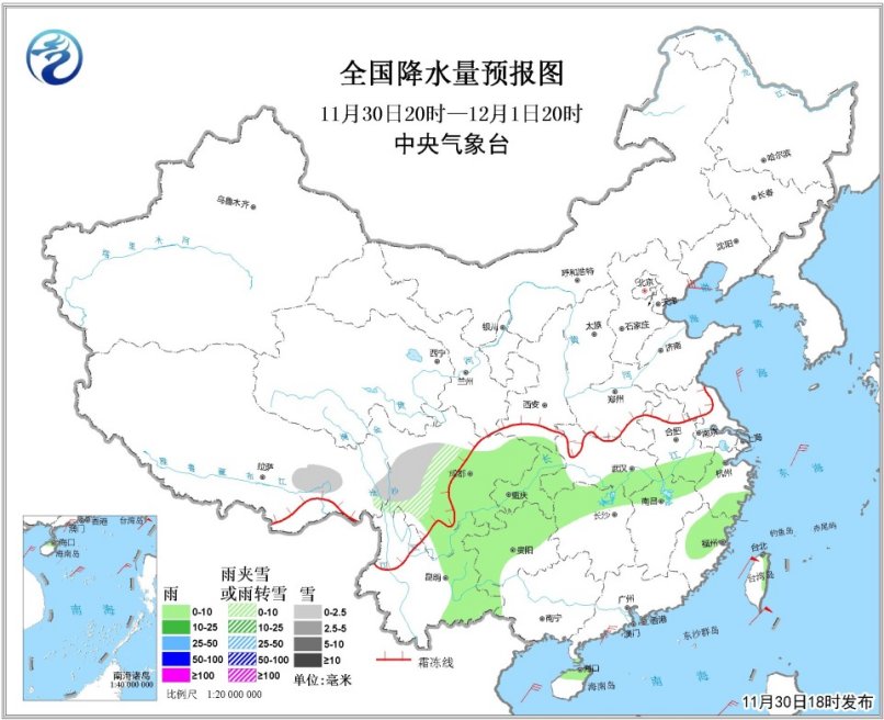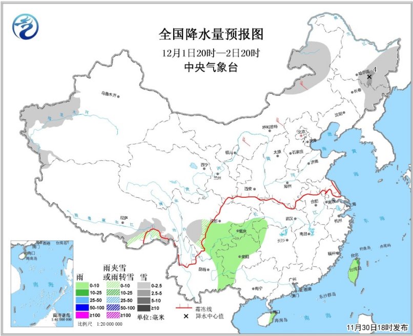 图1 全国降水量预报图(11月30日20时-12月1日20时)