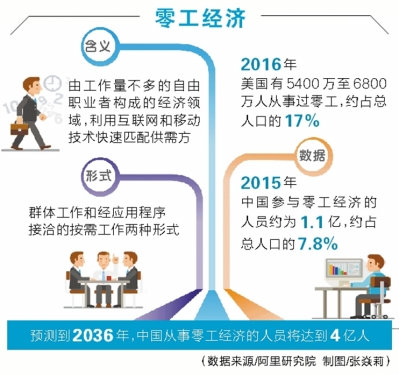 据统计,2016年在美国有5400万至6800万人从事过零工,约占全美国人口的17%。而根据阿里研究院的统计,2015年中国参与“零工经济”的人员约为1.1亿,占总人口比例的7.8%,同时阿里研究院也预测,到2036年,中国从事“零工经济”的人员将达到4亿人。
