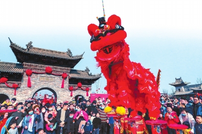 2月18日,郑州足球小镇内的舞狮表演和民俗演出吸引了众多游客。初步统计,足球小镇春节期间共接待游客17万人次,单日入园人数创新高。本报记者聂冬晗摄