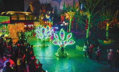 2月17日晚,郑州方特梦幻王国各式花灯齐亮,吸引众多游客前来游玩。本报记者聂冬晗摄